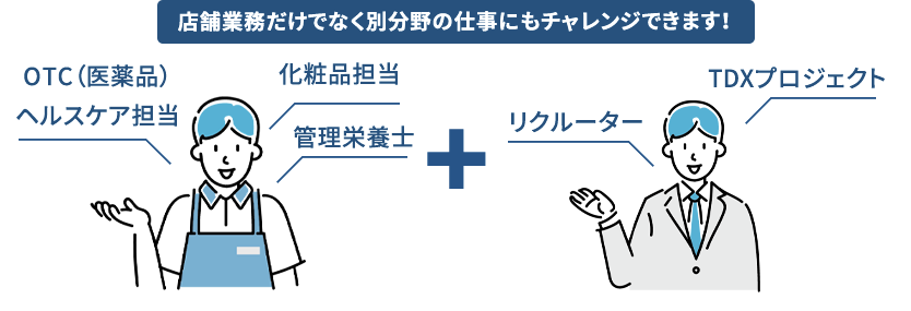 年々店舗数が増えているトモズでは、上位職のポストも年々増加中。実務経験を積み研修を受けた後には、入社3年目から店長職にチャレンジすることが可能です。20代からマネジメント(経営)の業務に携わることができ、さらには30代で約8店舗をまとめるブロック長、40代で約40店舗をまとめる地区長にキャリアアップすることも。また商品部や営業推進部などに若手からキャリアアップしている方も多数います。自身が望めばキャリアアップできるチャンスが整っているのもトモズの魅力です。