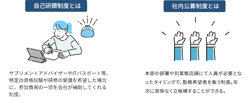 社員一人ひとりの意欲を尊重するトモズは、自身の意見を積極的に発信できる環境を整えています。キャリアについても同様です。公募制度を利用し、他部署や別業態の店舗に自分の意思でチャレンジすることができます。また、自身のキャリアプランを追求できることもトモズの大きな特徴です。自己研鑽研修制度を利用し、専門的なスキルを身に着けながら、自分の意思に基づいて自由にキャリアを形成できます。社員の「やりたい!」に、とことん向き合う会社です。